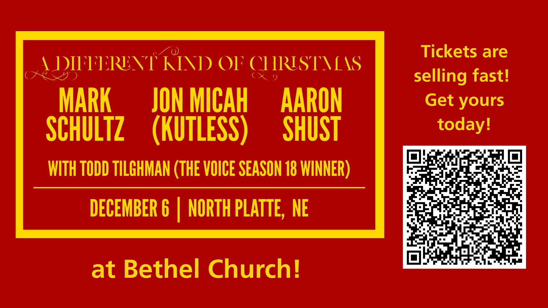 Join us this December at Bethel Church in North Platte as we celebrate a different kind of Christmas. Mark Schultz, Aaron Shust, Jon Micah (Kutlass), and Todd Tilgman (season 18 winner of the Voice) will start the season off with an amazing concert you won’t want to miss.